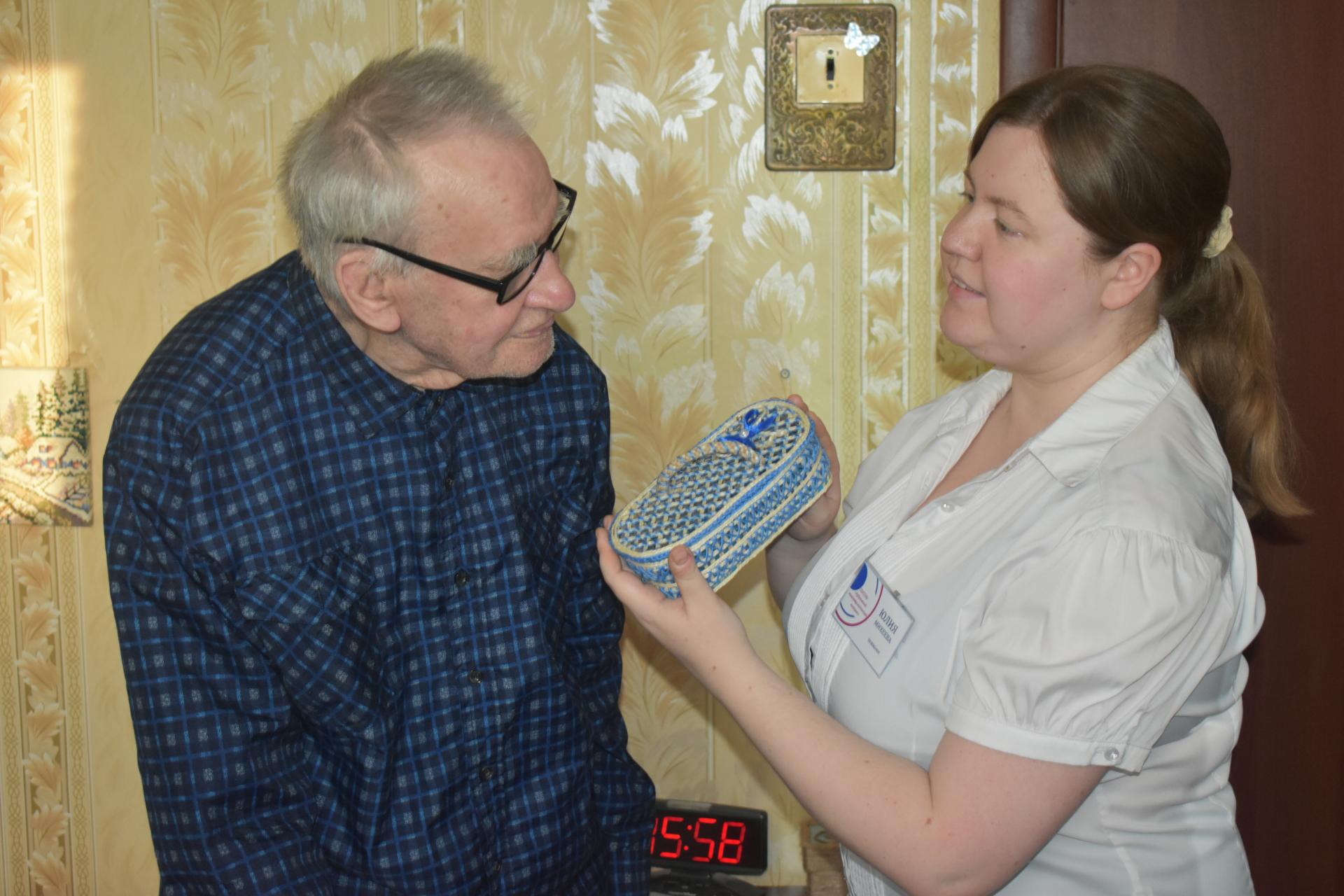 Получатели социальных услуг совместно с сотрудниками «Арбузовского интерната им. А. Л. Лосева» приняли участие в благотворительном марафоне «Спешите делать добро!». В творческой мастерской «Вдохновение» ребята: Лапшина Лариса, Краснов Сергей, Пакулова Светлана в рамках участия в акции «Помогать всем, кто нуждается своими руками» изготовили своими руками подарок - футляр для очков в технике джутовое плетение. Этот подарок был сделан персонально для пожилого человека, инвалида по слуху, Виноградова Валентина Гавриловича. Его детство пришлось на военные годы, он пережил голод, лишения и заслужил особое внимание со стороны общества и государства. Дети войны, как могли, приближали Победу в меру своих, хоть и маленьких, хоть и слабых, сил. Ребята, узнав историю Валентина Гавриловича, были тронуты его нелегкой судьбой настолько, что вдохновились на изготовление сувенира. Они вложили в изделие все тепло и уважение, чем очень растрогали дедушку.